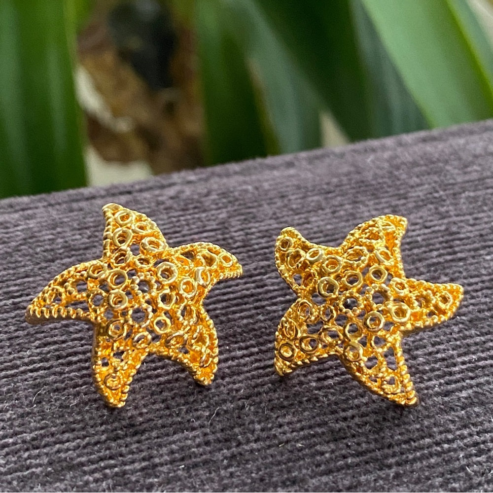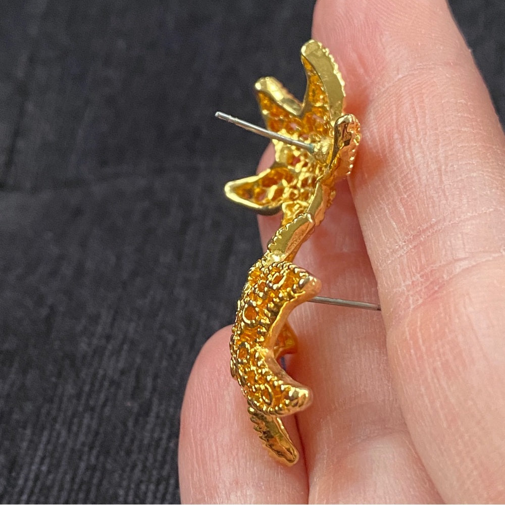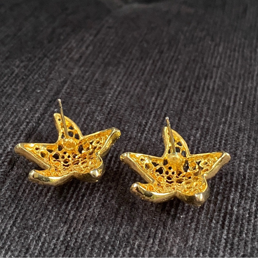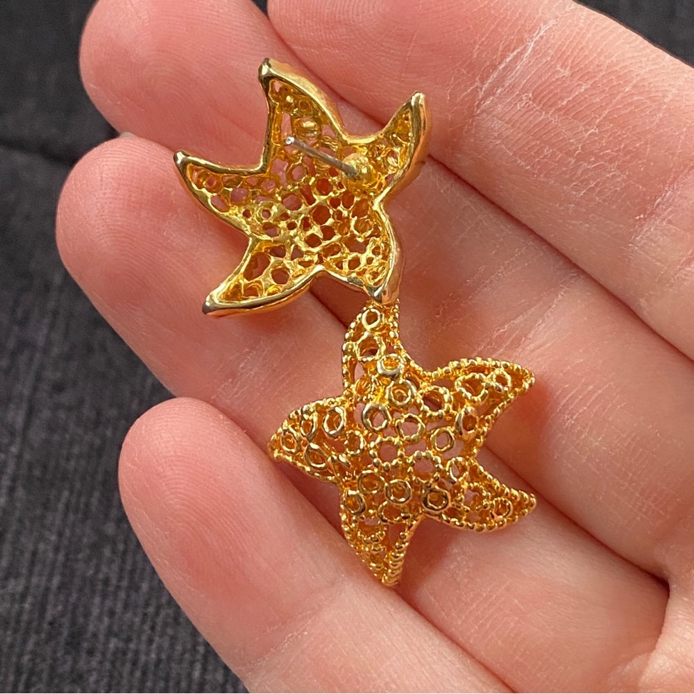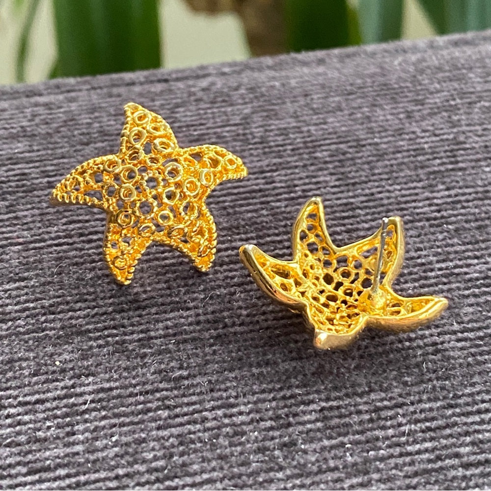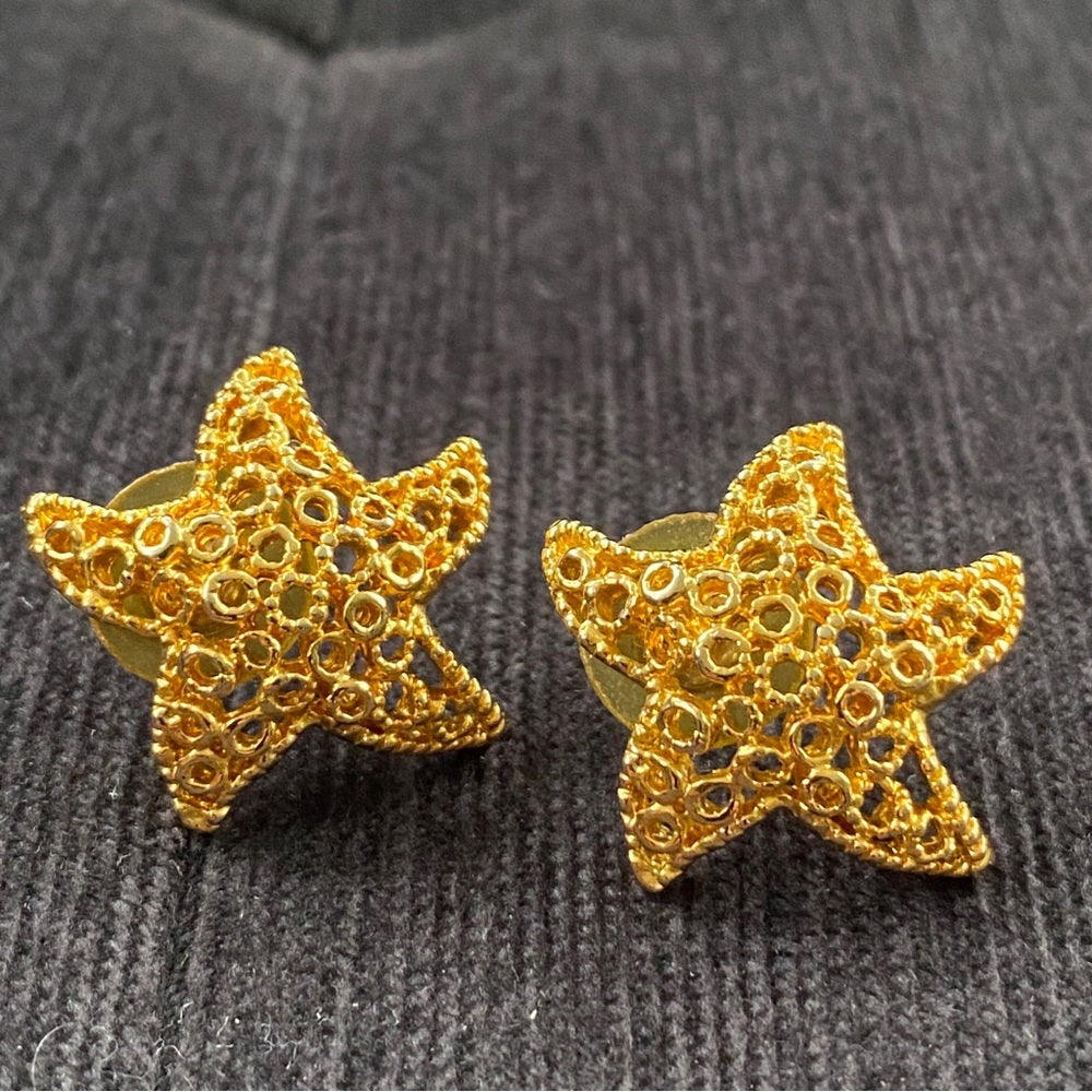 Nautical Gold Tone Mesh Starfish Earrings Pierced