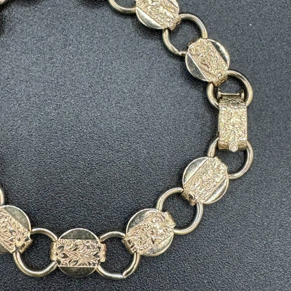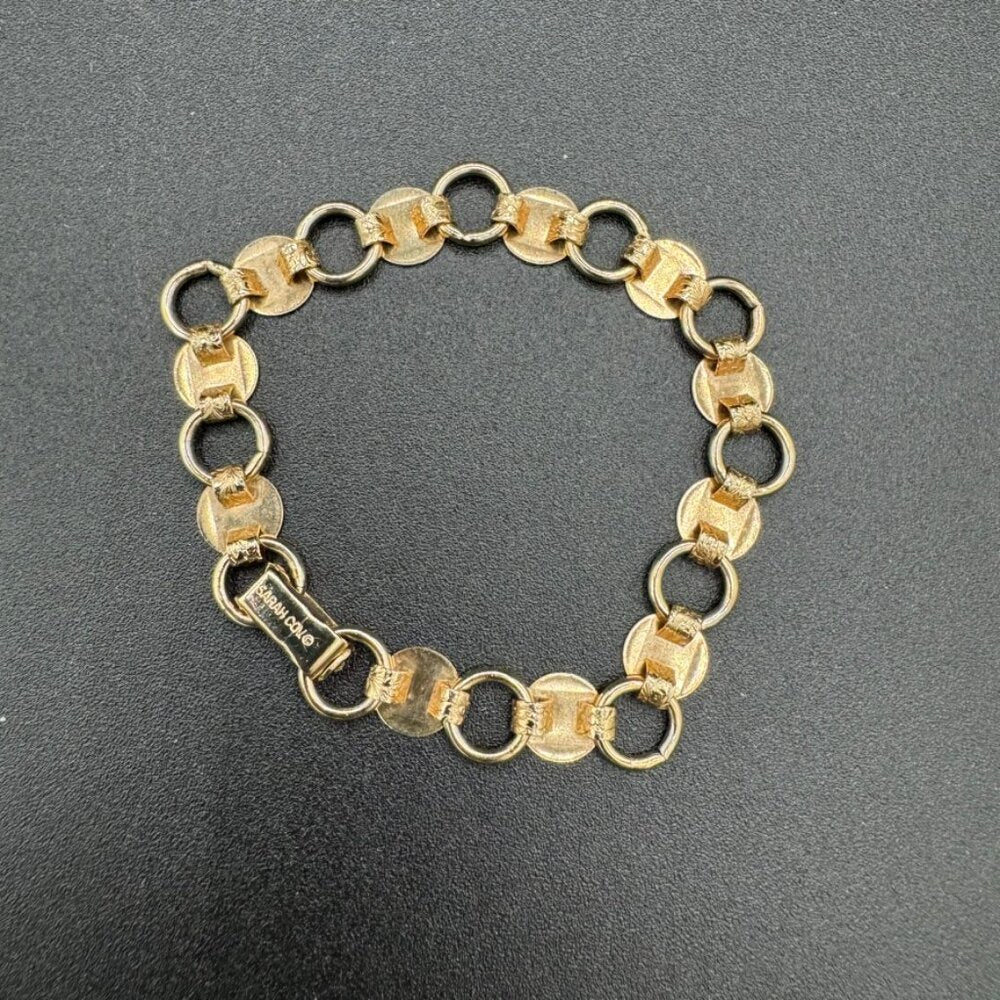 Experience the timeless elegance of the 1970s with this Sarah Coventry "Young and Gay" gold tone bracelet, featuring a beautiful chain of gold tone discs linked together. The signature Sarah Cov on the clasp adds a touch of authenticity. Let this fun and eye-catching piece of jewelry bring excitement to your wardrobe, with its unique textures and geometric shapes. A must-have addition to any fashion-lover's collection!