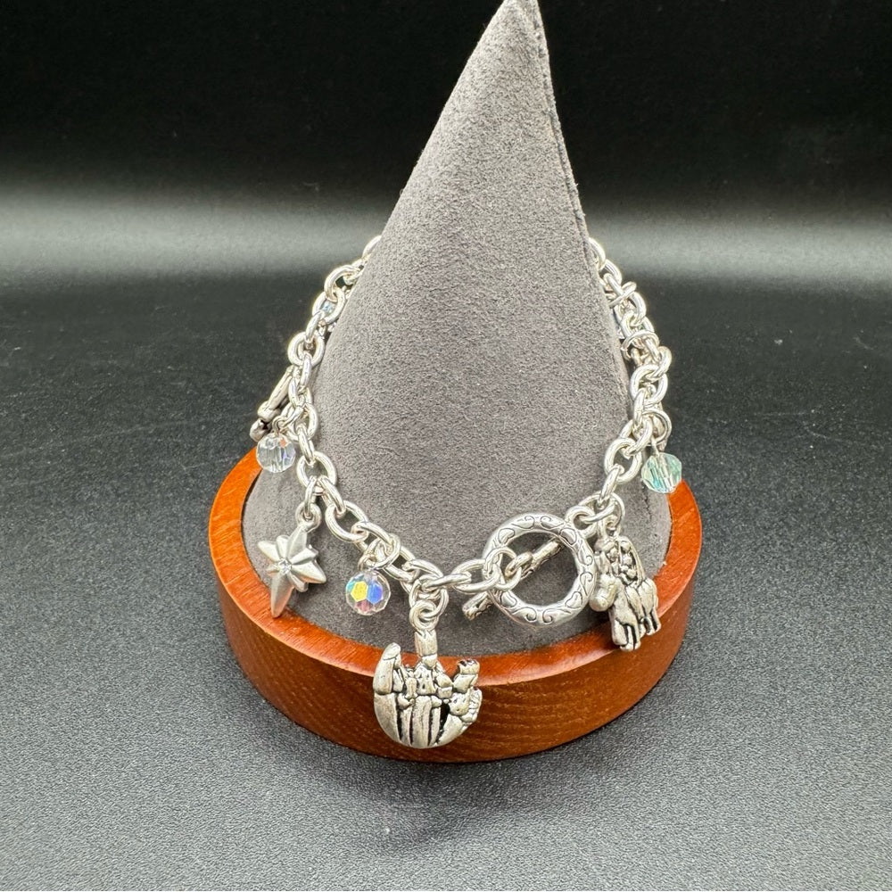 Religious charm bracelet depicting the story of the birth of Jesus with 7 charms of: The Three Wisemen, Bethlehem North Star (with rhinestone), Joseph / Shepherd, Angel, Stable Animals cow and donkey, Mary, and Baby Jesus in a manger