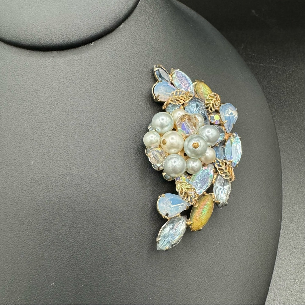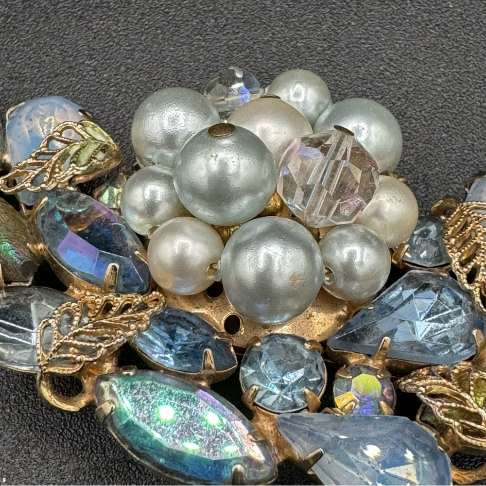 Very pretty iridescent blue tone rhinestones and lava rock rhinestones with gold tone filigree leaves and faux pearl centrepiece