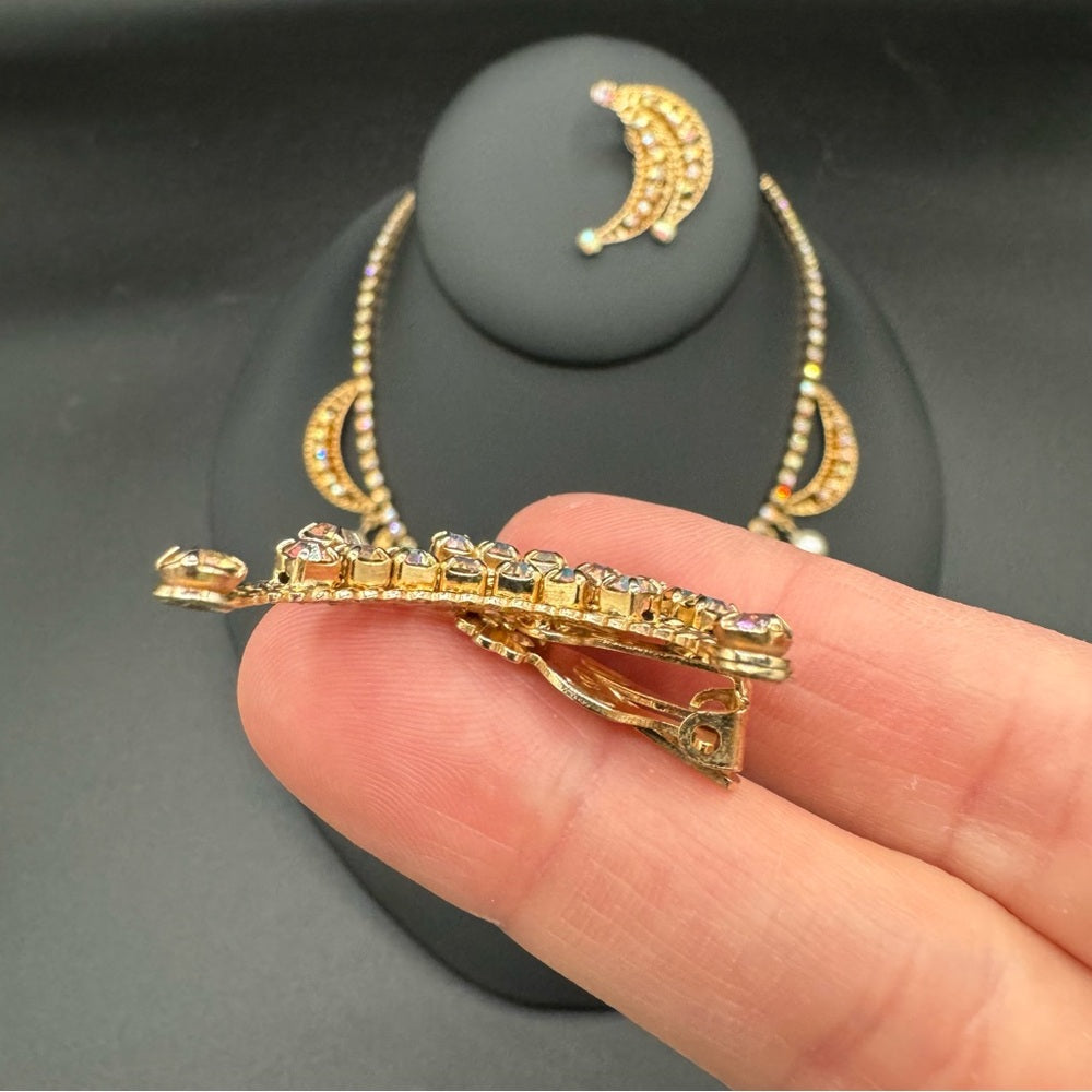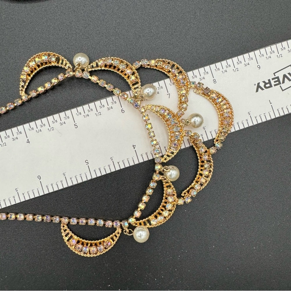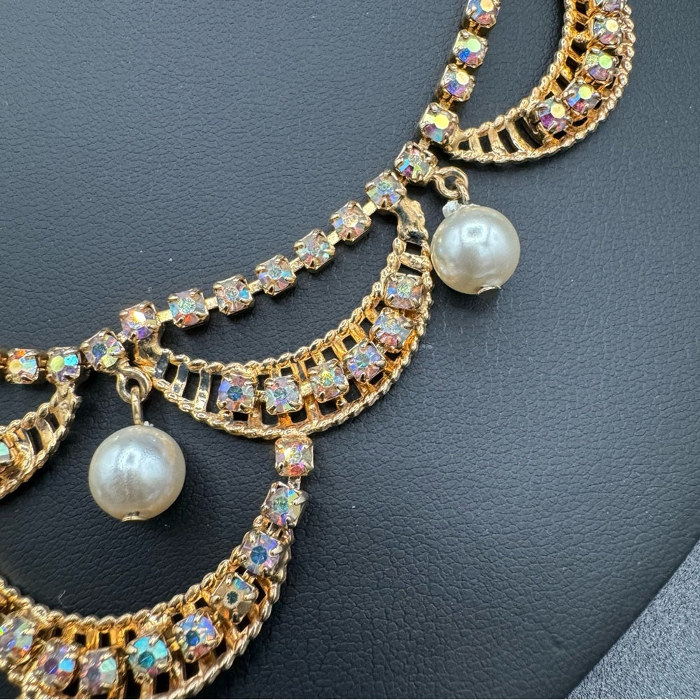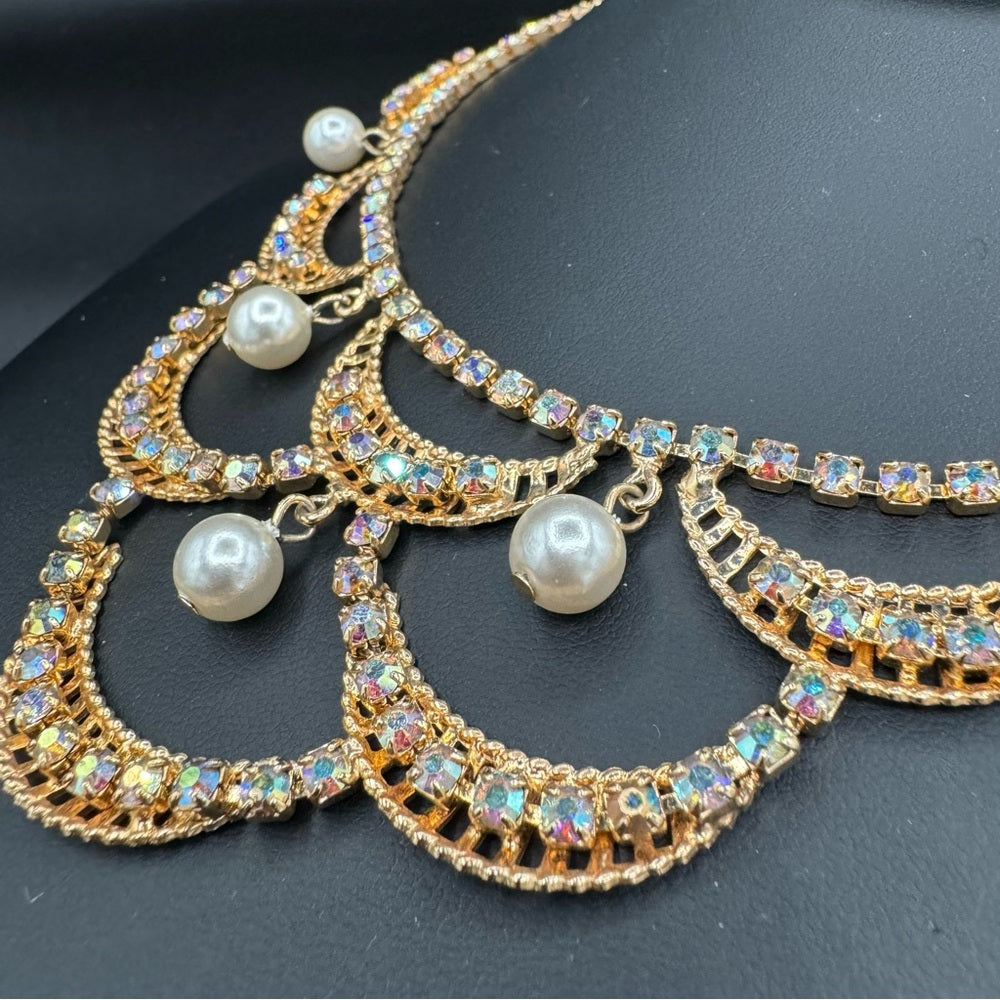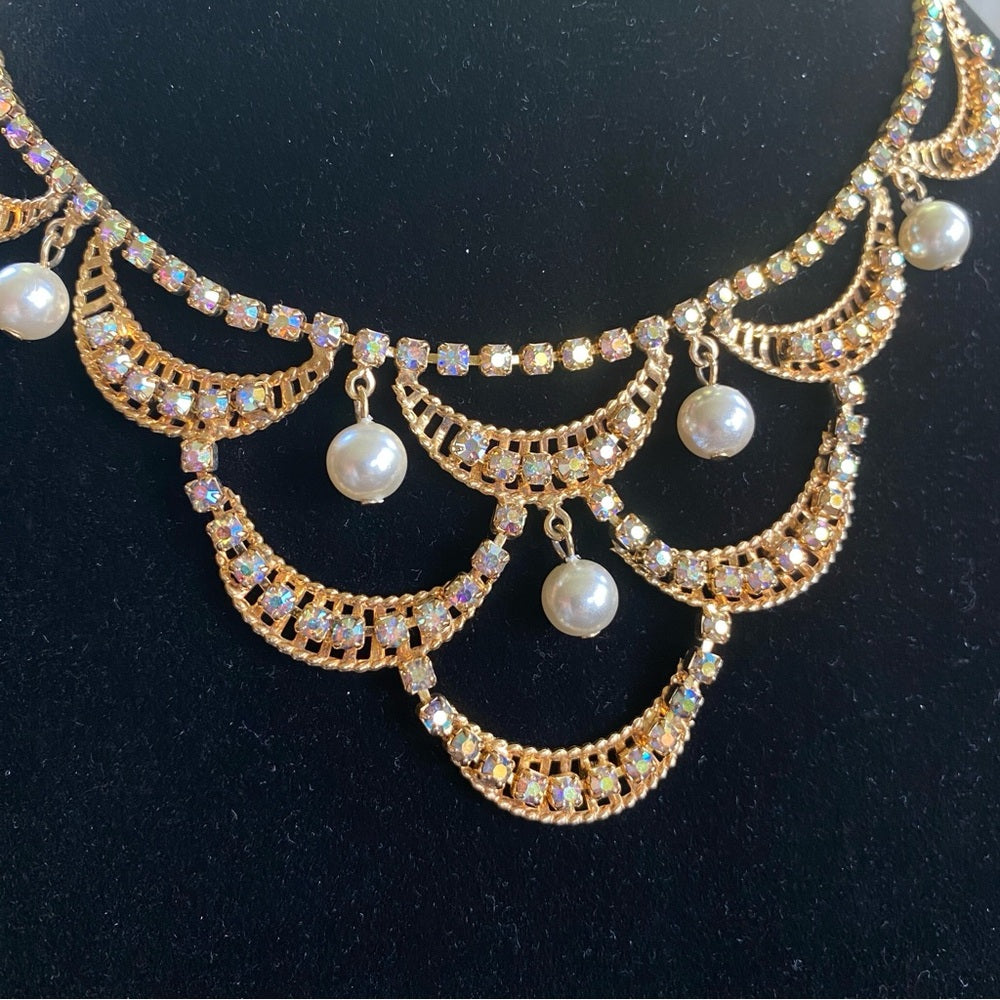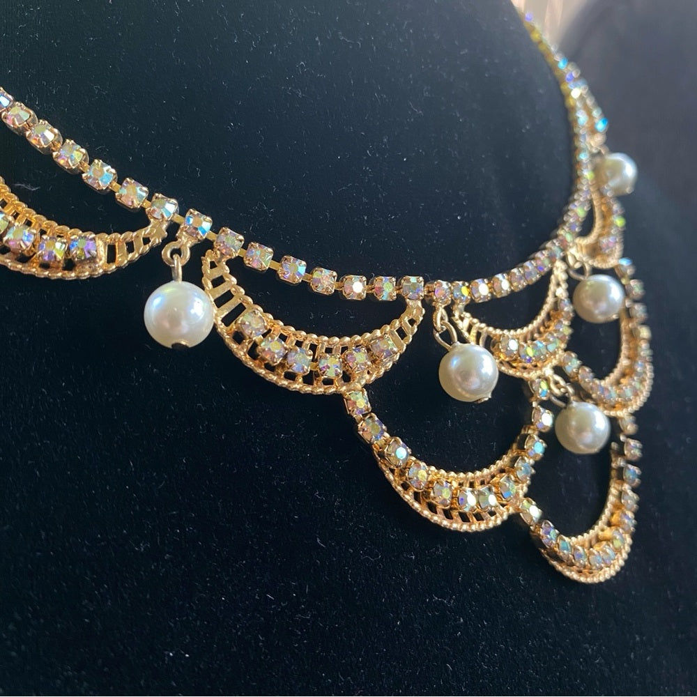 Stunning Crystal Rhinestone and Pearl Bib Vintage Necklace and Earring Set