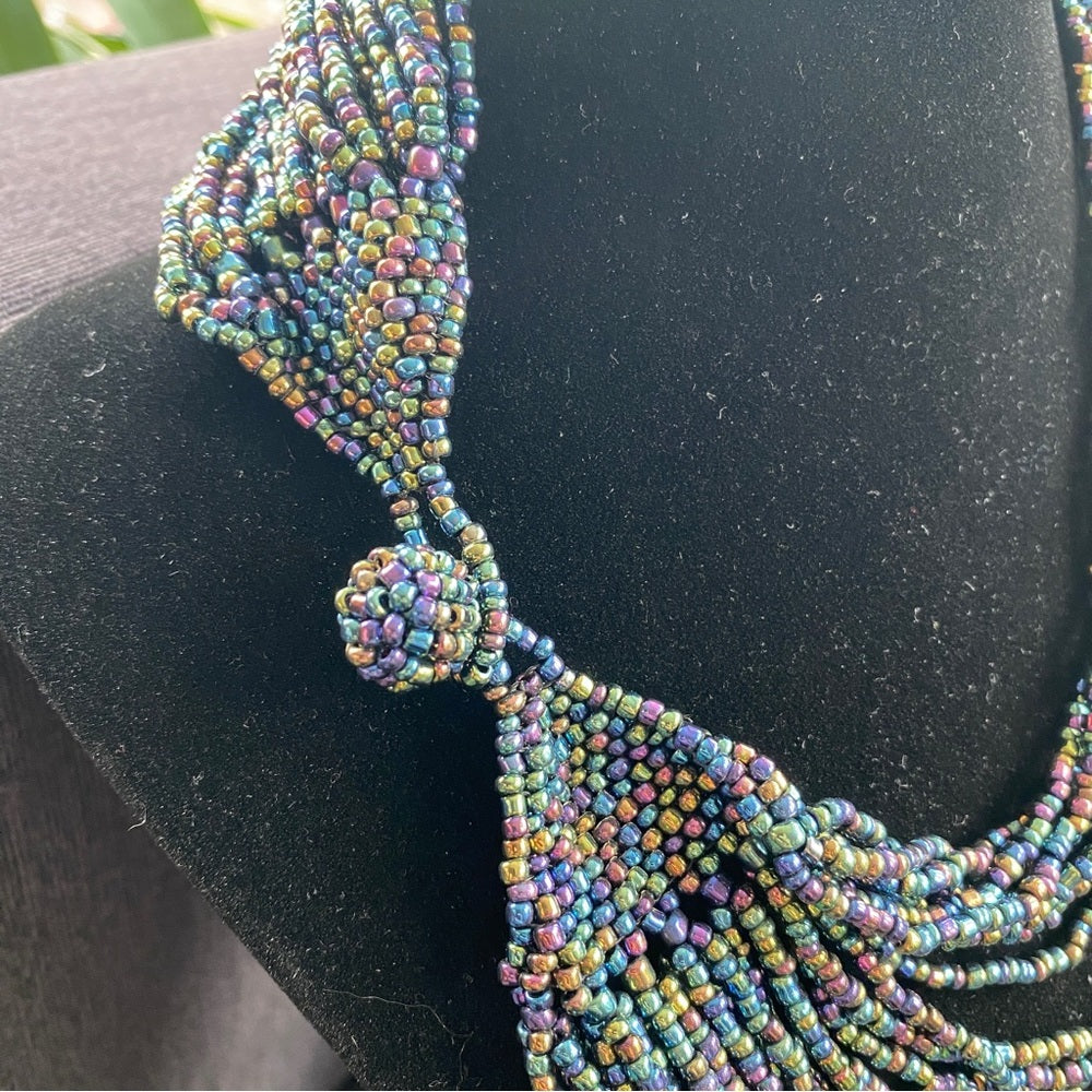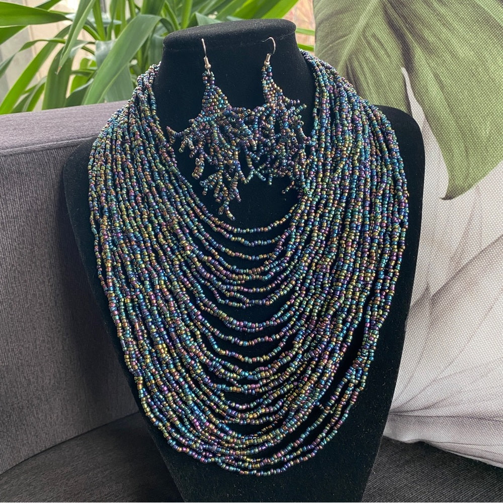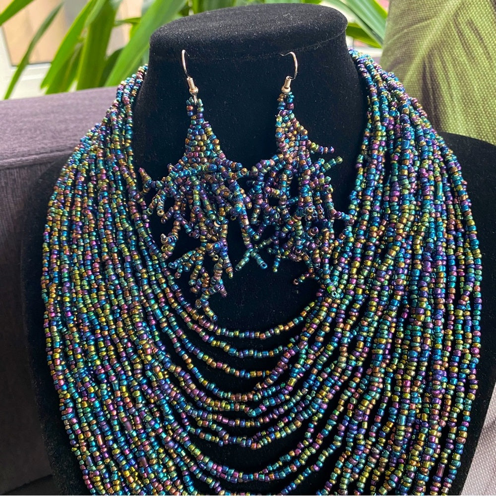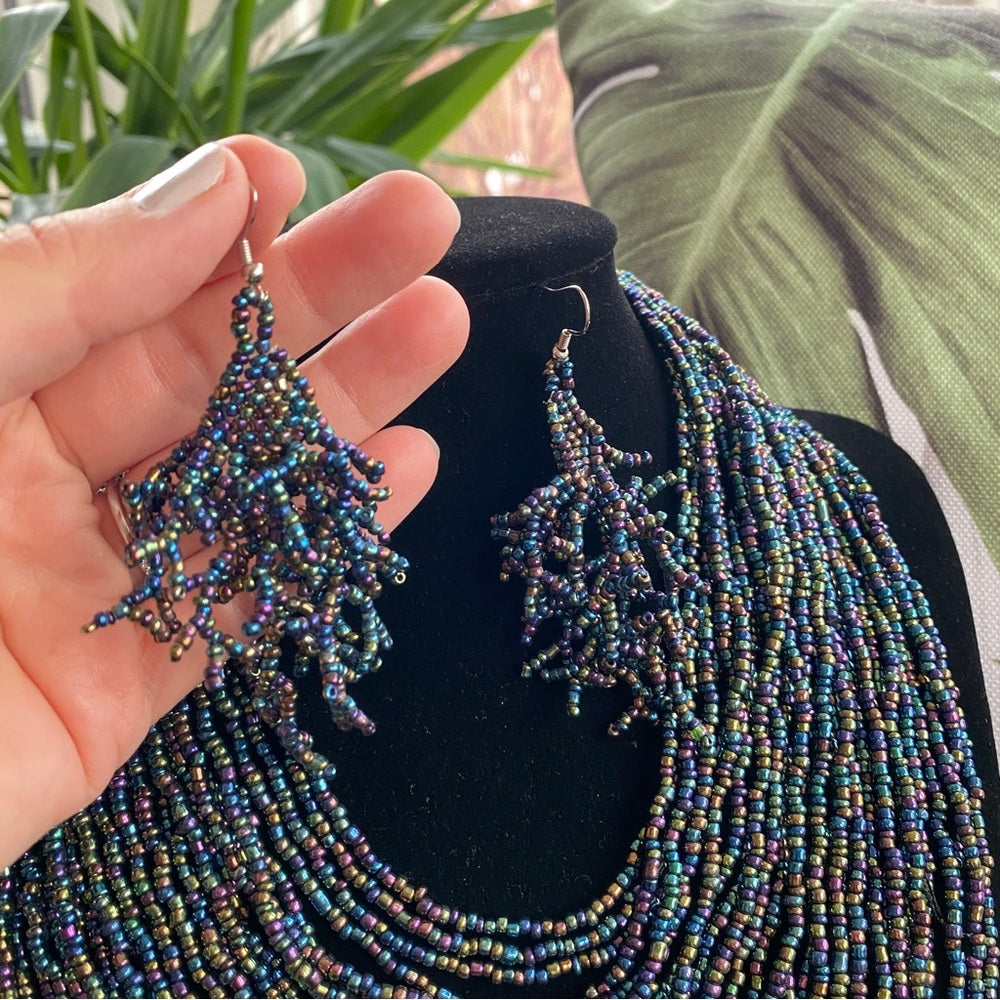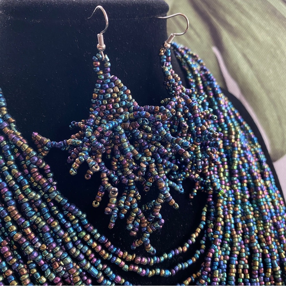Stunning Iridescent Multilayered Seed Bead Necklace and Dangly Coral Earring Set