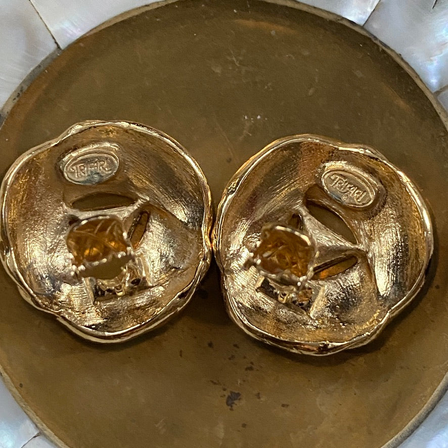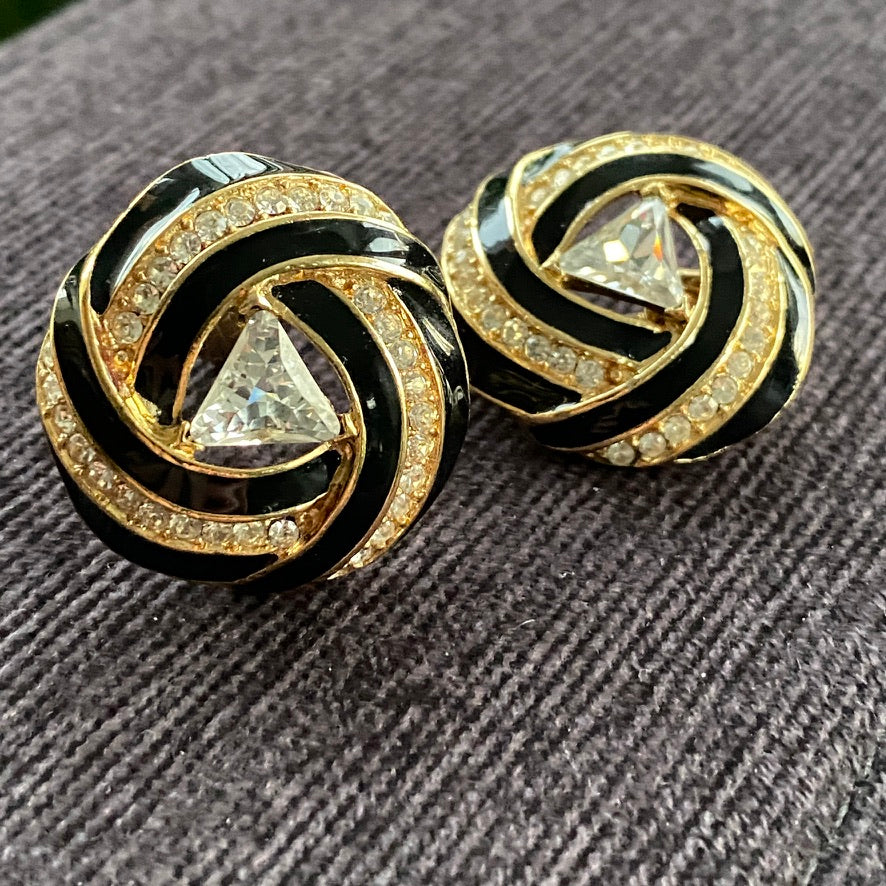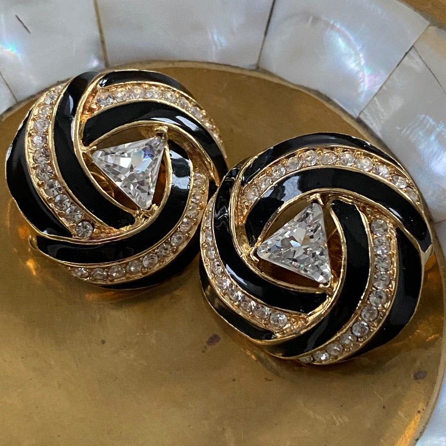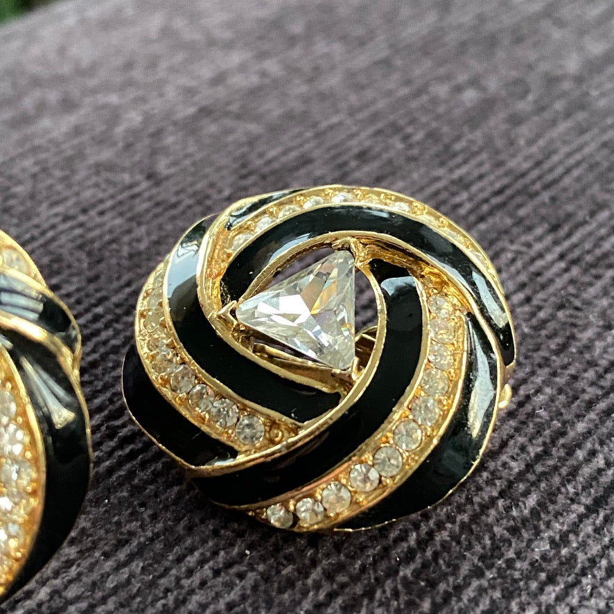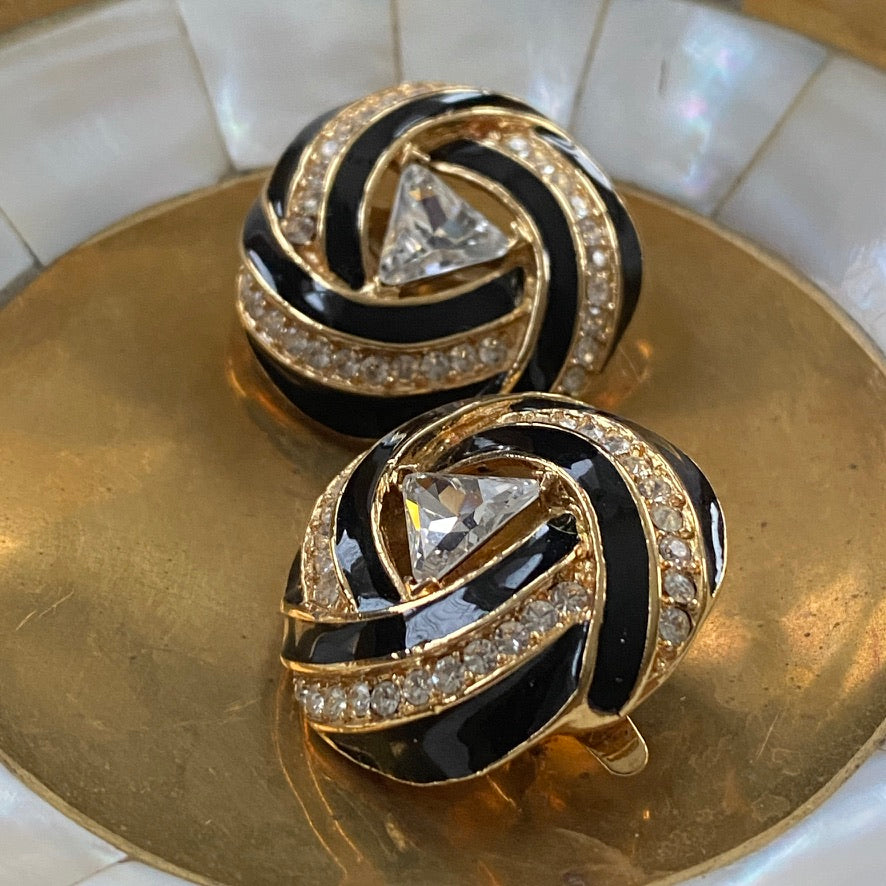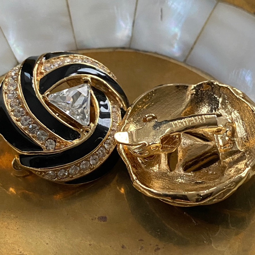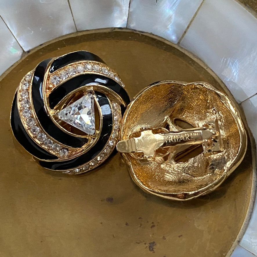 Trifari Signed Vintage 80s Glam Gold Tone and Black Clip On Earrings
