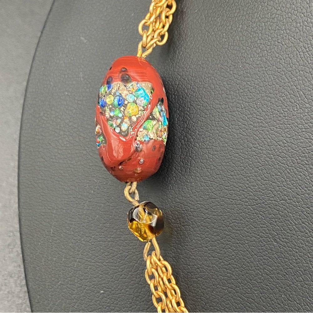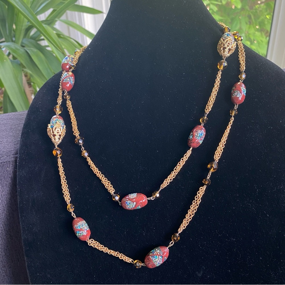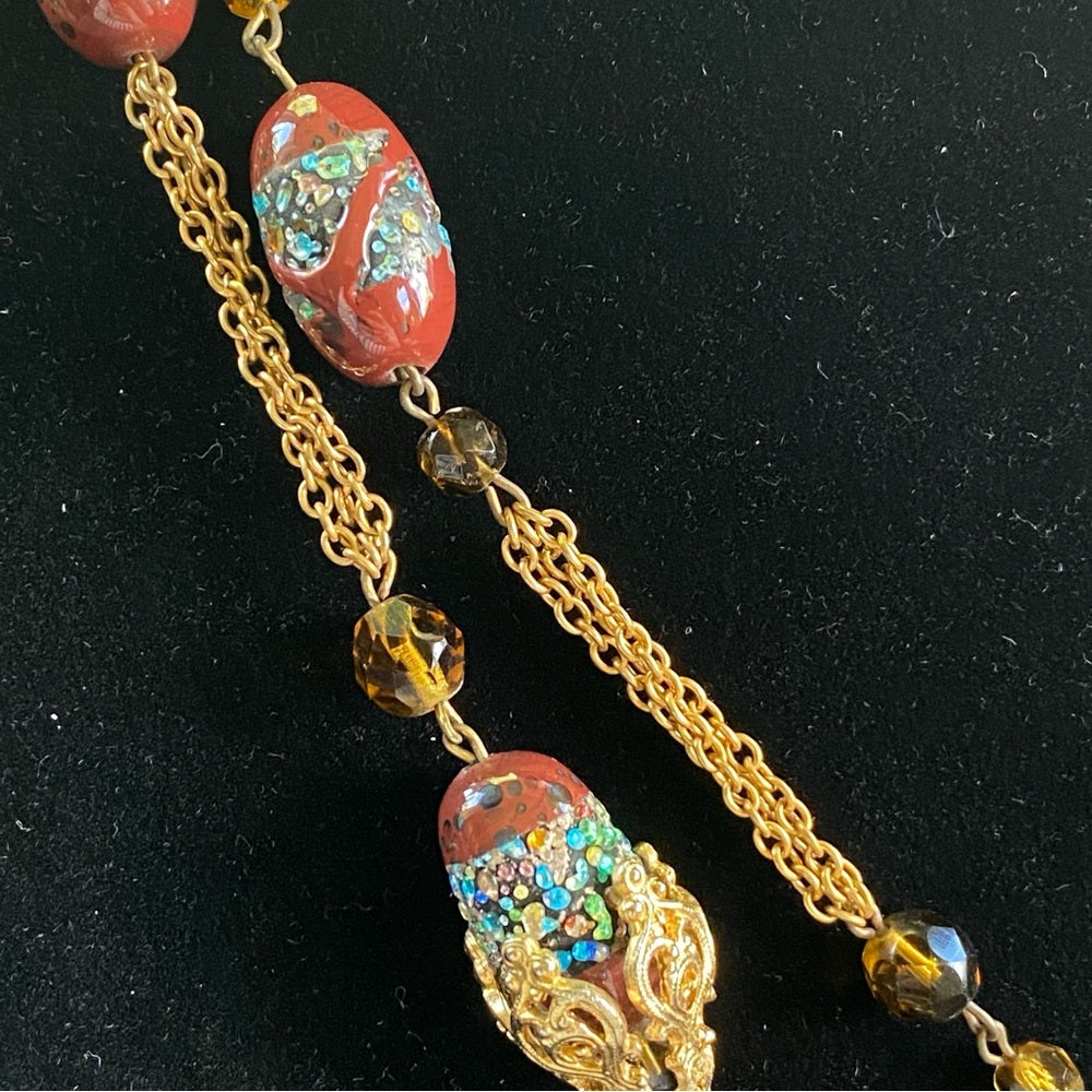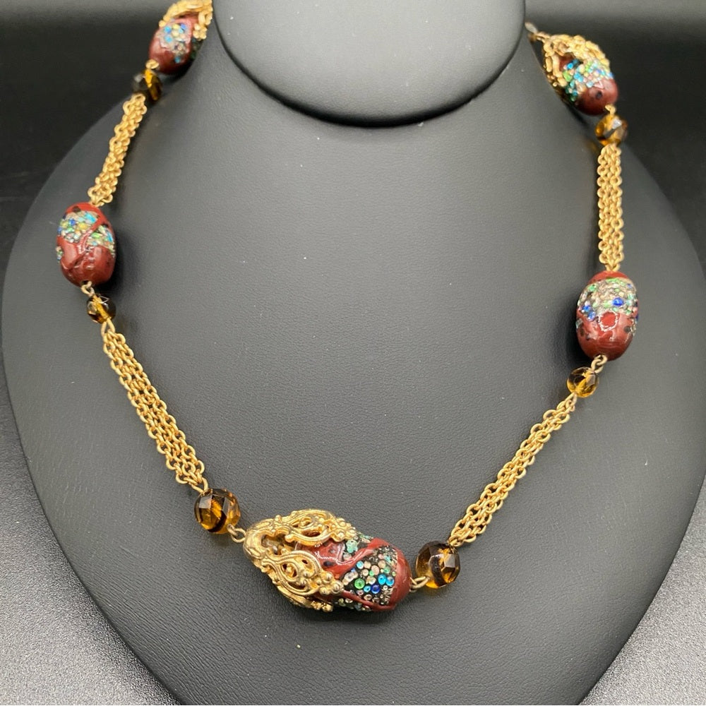 This exquisite, one-of-a-kind necklace boasts a rare and timeless vintage appeal. Its shimmering, textured glass beads in a striking brownish black hue give the illusion of being delicately dusted with rhinestones, adding a touch of glamour. The intricate gold filigree details adorn select beads, while amber glass spacers add dimension and charm. Though unbranded, the Venetian glass beads exude luxury and is sure to have been a prized possession. A truly breathtaking piece that exudes sophistication and elegance.