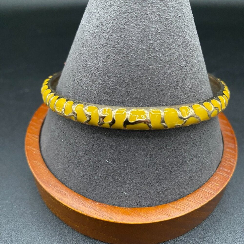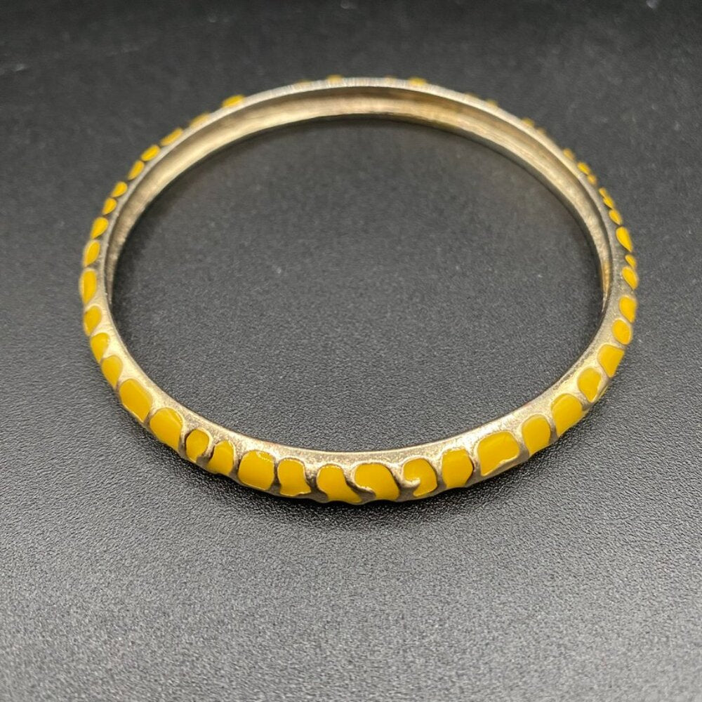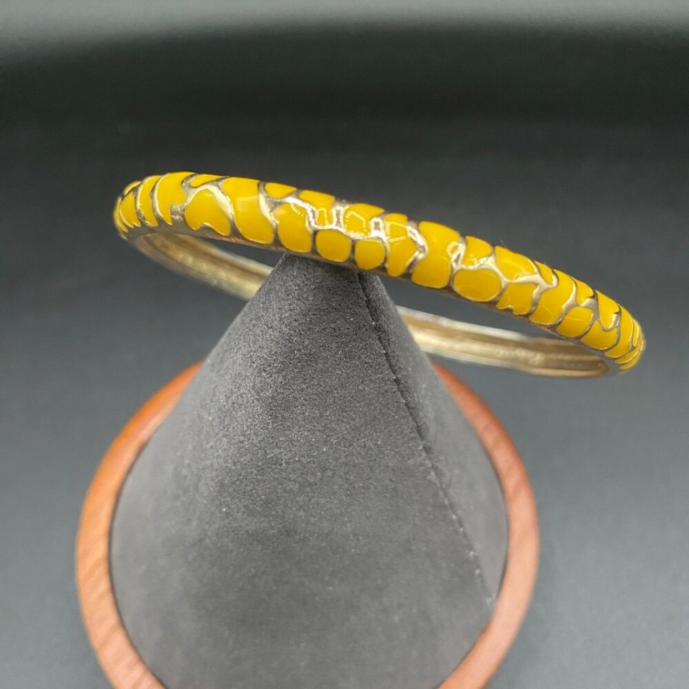 A stunning bangle bracelet in gold tone with a vibrant yellow enamel design. The geometric or giraffe print adds a unique touch that will surely catch anyone's eye. A good quality stacking bangle that could be worn with a number of outfits and occasions.
